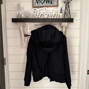 Sleek black Nike zip-up jacket. Has a zip away hood. You can wear it with hood or tuck it in collar & wear without. swoosh and collar lining. Athletic fit with elastic hem and cuffs.