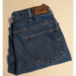LL Bean Natural Fit jeans in a classic medium wash denim. Crafted from durable 100% cotton, these five-pocket style pants feature a comfortable straight leg silhouette and a branded leather patch at the rear waistband. Designed with a standard zip fly and button closure, they offer a timeless look suitable for everyday wear.