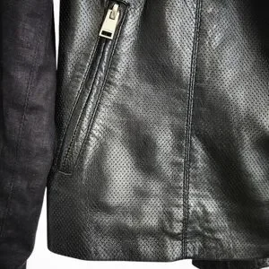 Features: Asymmetrical zip, perforated leather panels, zip pockets, mixed media design