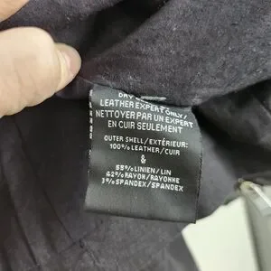 Black leather and linen jacket by Lamarque with a modern draped front and perforated leather detail. High-quality leather with a fitted silhouette. Linen sleeves and back.