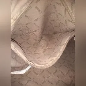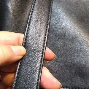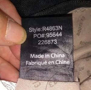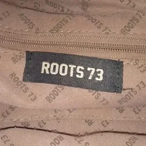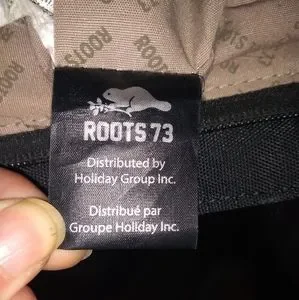 Roots 73 black faux leather shoulder bag, two handles. Inside zippered pocket plus an exterior zippered pocket. Very clean inside. Has some issues. One of the straps has been sewn and there are several strange marks on both handles (see photos). There is also a rub on one corner and some slight wear on the others (see photos).