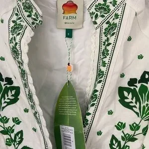 Long FARM Rio maxi dress with bold green floral print. Lightweight fabric with feminine embroidery details. Button-front style and subtle puff sleeves. Vibrant botanical pattern on a white base. Flaw is a stain in left upper chest. Have not laundered since it is new May come out…NWT. Smoke and pet free home.