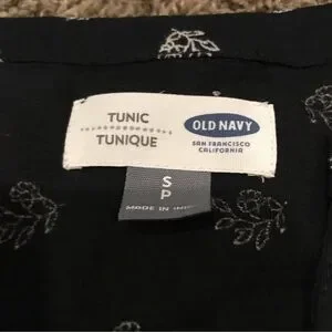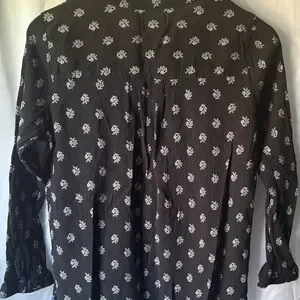 Stylish black tunic featuring a white floral print. Button-up style with three-quarter sleeves. Ideal for everyday wear.