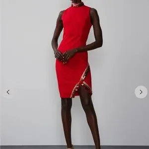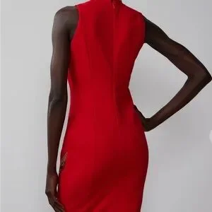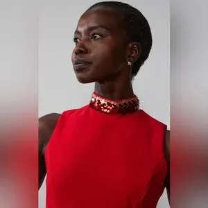 Elevate your style with this chic and sexy dress, the epitome of sophistication and glamour. This exquisite cocktail dress for women boasts a sleeveless design that perfectly showcases your shoulders, complemented by a mock sequin neck that adds a touch of sparkle to your look.