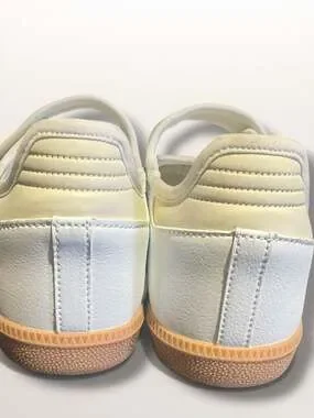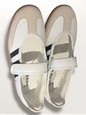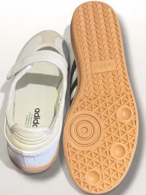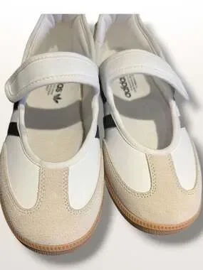 Adidas Originals Samba Jane Women's Shoes In White. These unique Mary Jane style sneakers feature a sleek leather upper with the iconic three-stripes and a hook-and-loop strap for a secure, adjustable fit.