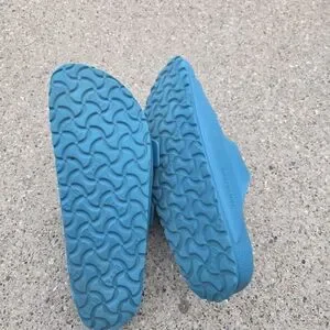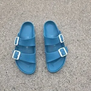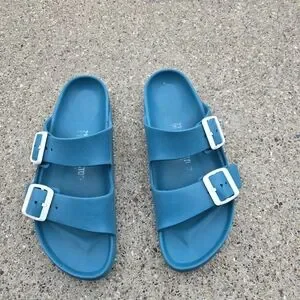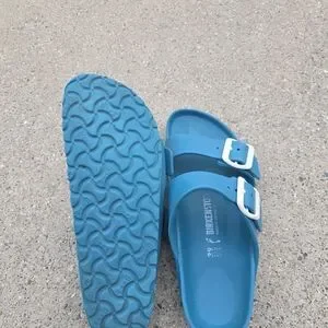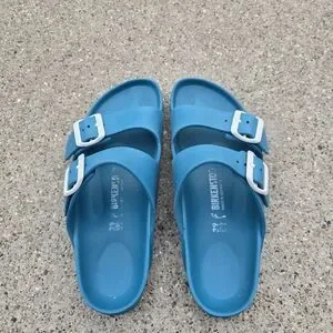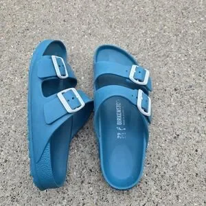 Used Birkenstock sandals. Good condition and quality. Has wears but in good shape.Bright teal slip-on sandals with two adjustable white buckles. Lightweight and casual. Perfect for warm weather wear. Women's size 39(8)