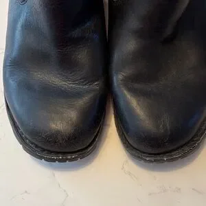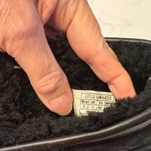 UGG Australia Sturdy black leather boots with soft fleece lining for added warmth. Rugged rubber outsole delivers reliable traction on varied surfaces. Easy slip-on style with padded collar for comfortable all-day wear. Average condition- please see pictures for toe wear- I did not use any special cleaners or conditioners on these boots. Tote 41
