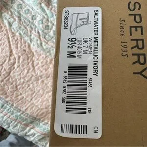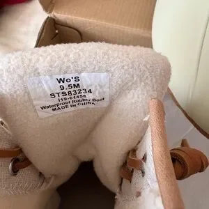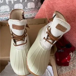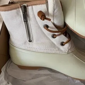Cream metallic fleece-lined Sperry boots with tan leather laces and trim. Waterproof rubber lower. Cozy interior for cold, wet days. Classic casual style.