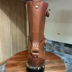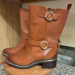 Step out in style with these elegant brown leather calf high boots. Perfect for any occasion, these boots offer both comfort and sophistication. Size 7wide. Worn once then stored