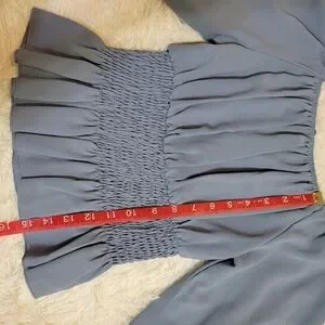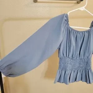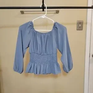 SHEIN LUNE Dusty Blue Shirred Waisted Frill Trim Peplum Blouse size XS