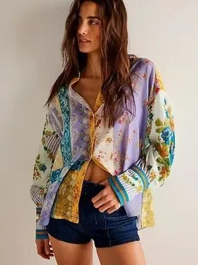 Relaxed button-down with mixed floral and patchwork panels. Long sleeves with striped contrast cuffs. Slightly cropped hem for easy layering. Lightweight woven fabric with vibrant prints. Honey you can wear this on almost anything pants, jeans, skirt, shorts, dress.