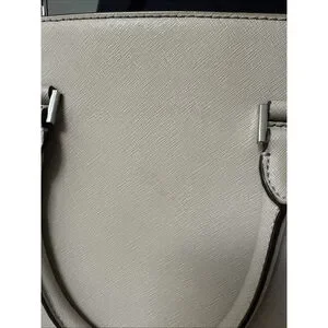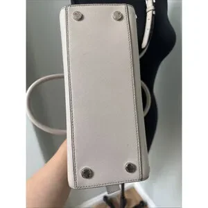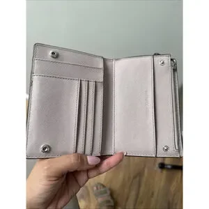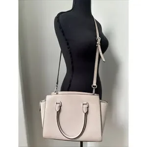 The Michael Kors Stud Selma Medium handbag is a stylish satchel/top handle bag made of leather with silver hardware accents. It features a zip closure, studded accents, and comes with a matching wallet. The exterior color is blush, with a beige lining, and includes inner pockets, an adjustable cross-body strap, and a key clip for added convenience. This handbag from the Michael Kors Selma product line is perfect for women looking for a fashionable yet practical handbag with a touch of edginess from the studded accents.