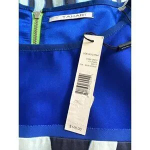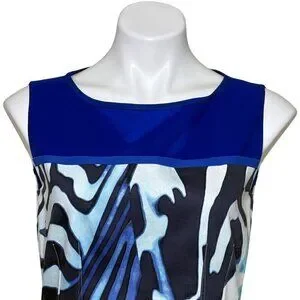 The T Tahari Shira Dress features a vibrant zebra-inspired print in shades of blue and white. Constructed with a cotton blend for comfort and durability, this knee-length dress is ideal for stylish and polished looks. Its sleeveless design and bright green back zipper enhance wearability.
