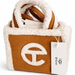 Compact suede tote with crossbody strap and plush cream shearling trim. Signature Telfar logo in contrasting shearling. Top handles for handheld wear. Warm chestnut hue for seasonal style. New with tags. Comes with the dust bag.