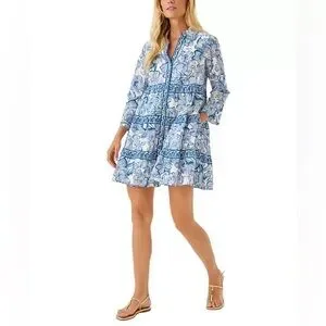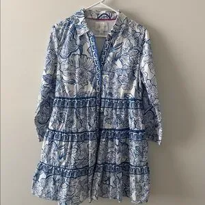 Lightweight tiered shift dress by Lilly Pulitzer. V-neck with button-front placket. Long sleeves and relaxed fit. All-over blue and white floral print.