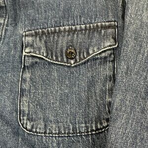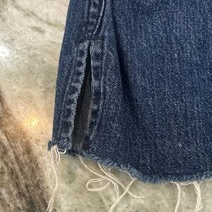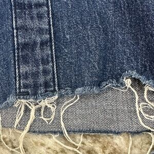 Cropped denim shirt jacket by rag & bone. Button-front with single chest pocket. Distressed raw hem for an edgy look. Long sleeves with button cuffs. Classic indigo denim color.