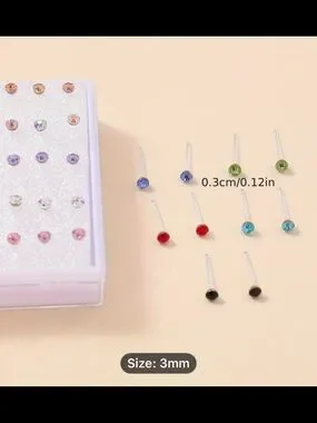 Delicate 3mm nose studs featuring multicolor gemstones. Includes blue, green, red, black and aqua options for versatile styling. Comfortable posts designed for everyday wear. Bright, faceted stones add subtle sparkle to any look.