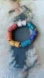 African Krobo bead bracelet, handcrafted in Ghana from recycled glass. Recycled glass bottles are pulverized into a fine powder, poured into clay molds, and fired in traditional kilns. The vibrant rainbow pattern is achieved by layering colored glass powders or applying a hand-painted glass paste before a second firing. The bracelet features small brass spacers between the glass cylinders. In authentic Ghanaian jewelry, these are often cast using the "lost wax" technique, where each individual bead requires a unique mold that is destroyed after casting. Stretch Approximately at 6.5"