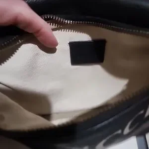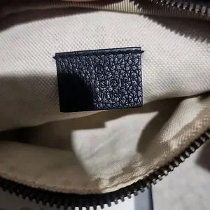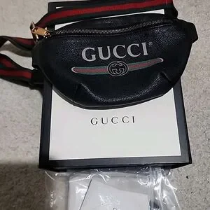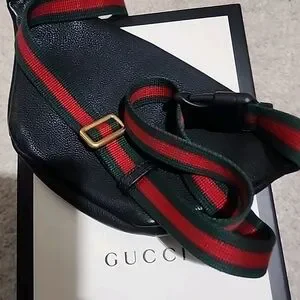 Authentic Gucci belt bag in pebbled black leather. Features signature red and green web stripe and logo print. Gold-tone hardware and adjustable striped strap. Compact hands-free style. Versatile everyday accessory.
