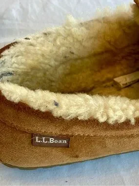 L.L. Bean moccasin slippers in chestnut brown suede. Plush shearling lining for cozy warmth. Hand-stitched toe detail. Easy slip-on design for everyday comfort.