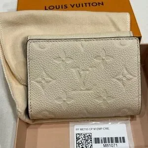 Louis Vuitton compact wallet in cream monogram Empreinte leather. Embossed LV pattern across the exterior. Gold hardware with S-lock. Six card slots. Two flat pocket. Gusseted zip coin pocket. Measures 4.5” x 3.3” x 1.6”. Box, dust bag, tag. Retail $1,140 (plus applicable tax).