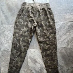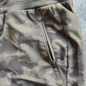 Comfortable women's track joggers in olive camouflage. Features a drawstring elastic waist and zip pockets for secure storage. Tapered fit with ribbed ankle cuffs for a streamlined look. Designed for everyday comfort and casual wear in olive camo.
