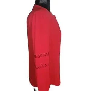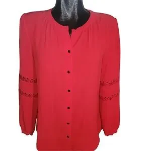 Le Chateau red blouse with lace and silver bead embellished sleeves. Full button front with silver toned buttons.