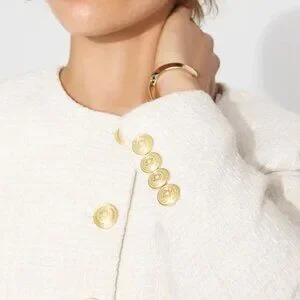 We designed the neutral layering jacket for work or play. Beautiful velvet basket weave tweed fabric is tastefully accented with gold crest buttons on the placket, front pockets, and sleeve cuffs. Slight shoulder pads give this top layer polished attitude.