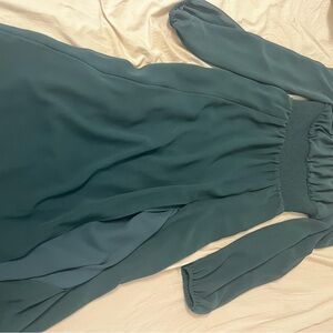 Flowy teal maxi dress with long sleeves. Smocked waist for a flattering fit. Lightweight, draped fabric. Simple, elegant silhouette. Could fit up to a size small.