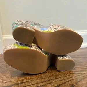 Leather platform sandals with snakeskin print in multicolor hue. Each pair is a little different. Perfect for any summertime party