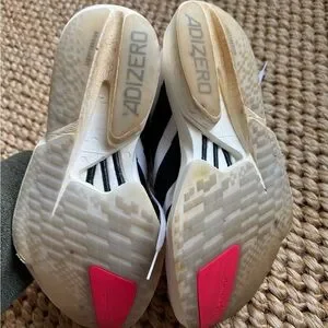 Lightweight adidas adizero pro 4 running shoes. White mesh upper with black overlays. Neon accents at eyelets and heel. Bright red inner collar. Cushioned sole for running comfort. Worn only 3 times!