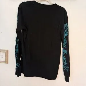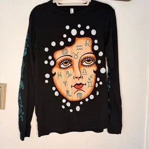 Black long sleeve tee with a bold orange face graphic. White dot accents surround the design. Teal zodiac symbols and sleeve accents. Soft cotton look. Eye-catching and unique.