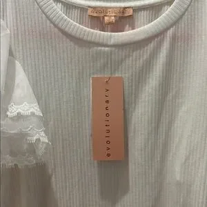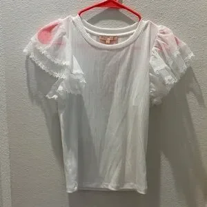 Soft white ribbed top with delicate lace puff sleeves. Feminine design that layers easily for everyday wear. Lightweight and breathable fabric for comfortable all-day play. Pretty white style suitable for special occasions or casual outfits. Pit to pit 15 inches 21 inches long