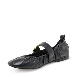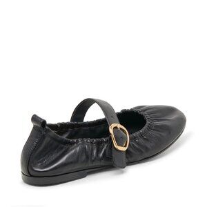 Chic and versatile Schultz flats in black leather. Classic Mary Jane silhouette with a soft ruched leather upper and adjustable buckle strap. Comfortable, timeless, and easy to dress up or down.