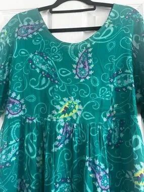Green paisley dress with V-neckline. Short sleeves and a relaxed fit. Accents of purple and yellow in the print.
