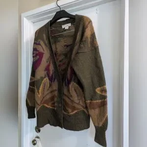 Cozy cardigan with earthy patterns. Features olive and purple tones. Perfect for layering.