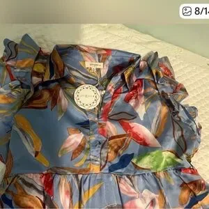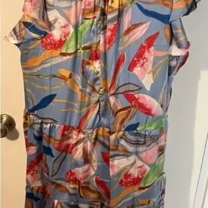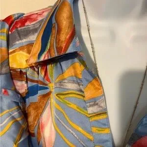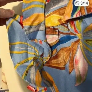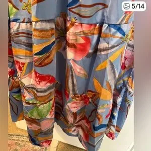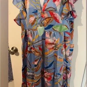 Flowy maxi dress with ruffle sleeves. Vivid abstract floral print. Tassel accent at neckline. Lightweight, breezy fabric. Bold multicolor pattern on a light blue base. Silky flowy fabric. Medium will fit a large too!