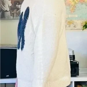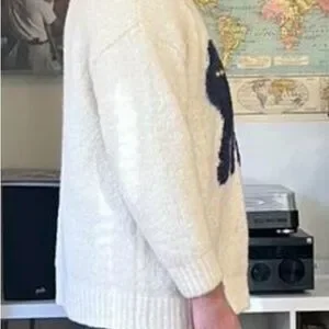 Cozy cream crewneck sweater featuring a bold black cat applique with bright eye accents. Soft knit fabric for comfortable everyday wear. Playful black cat detail adds personality to neutral cream styling. Easy to layer for casual looks.