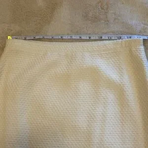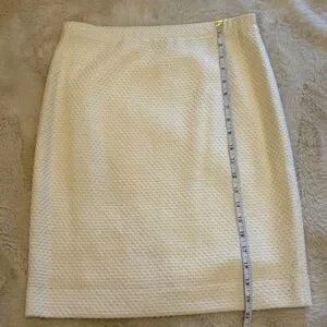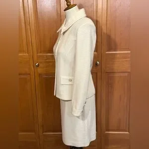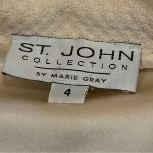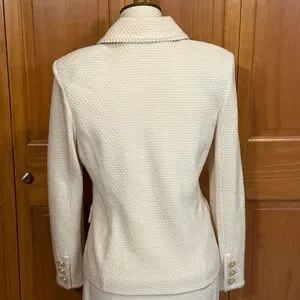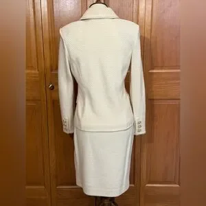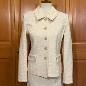 St. John two-piece set in soft cream knit. Structured jacket with classic lines and shoulder pads. Coordinating skirt for a cohesive look. Waistband of skirt is elasticized. Refined and versatile ensemble. Jacket and skirt are lined. Excellent condition, like new. Size 4. Stunning!
