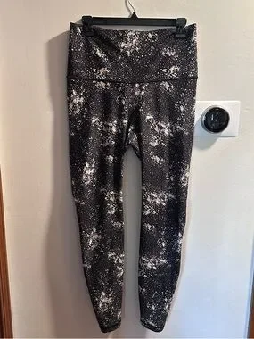 Old Navy active leggings with an abstract speckled pattern. Stretchy, smooth fabric for workouts. High-rise silhouette for coverage.