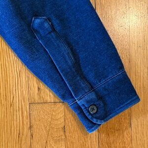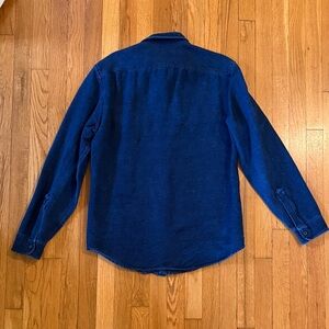 Casual Wallace & Barnes indigo blue button-down shirt jacket. Soft, durable fabric for everyday layering in a rich indigo blue. Versatile piece that pairs well with denim or chinos.