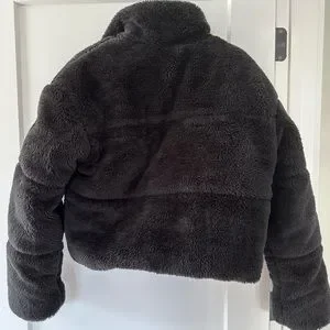 Cozy sherpa exterior with a high stand collar. Cropped puffer silhouette for a modern fit. Zipper closure and side pockets. Soft, plush texture for warmth.