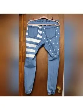 NWOT. Denim with white stars and stripes. Jogger fit. elastic waist and cuffs. Size XL