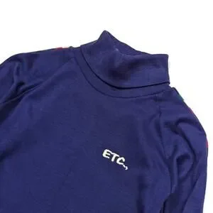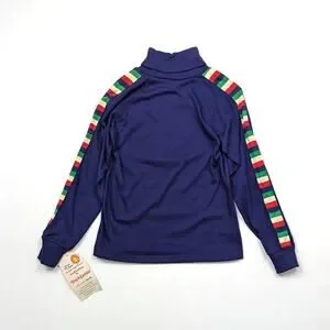 Vintage Tog-a-longs navy turtleneck with a cool stripe sleeve and embroidered chest. Size is tagged as 10, but the length indicates it runs small, better fits as 6x. Please check the measurements provided.