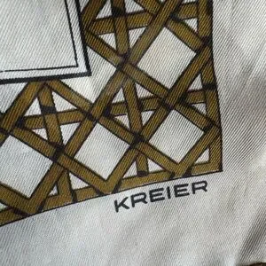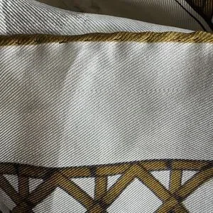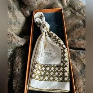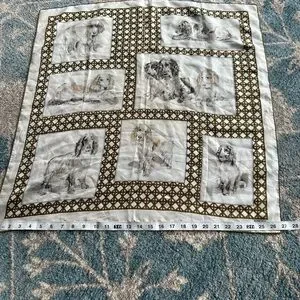 Elegant ivory silky scarf with detailed dog illustrations. Gold geometric border accents. Soft sheen and classic style. Versatile accessory for wardrobe styling.