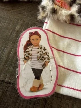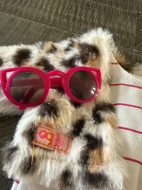 Faux leopard fur cropped jacket paired with a white tee featuring thin pink stripes. Includes bright pink cat-eye sunglasses and tan-orange boots. Cute coordinated set for dolls. Fits our generation and American girl. Brand new but box was damaged. Removed everything to make sure nothing was damaged.