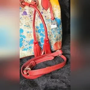 Dooney & Bourke tote with colorful splatter print on signature logo canvas. Red leather handles, trim, and tassel drawstring. Gold-tone hardware and branded charm. Detachable red shoulder strap included.