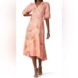 Kate Spade Falling Flower Wrap Midi Dress Pink Orange Puff Sleeve Size 4
