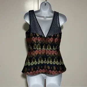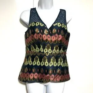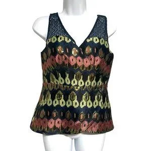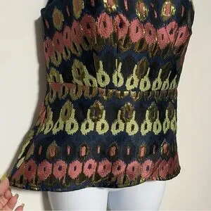 Fitted V-neck peplum blouse metallic multicolor ikat Sleeveless eyelet detail.