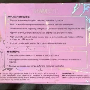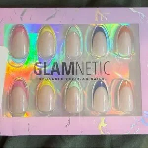 GLAMnetic reusable press-on nails with a nude base and colorful French tip accents. Easy to apply and remove for a salon-look at home. Lightweight, durable design for everyday wear. Includes mixed pink, yellow, green, blue, and peach accents.
